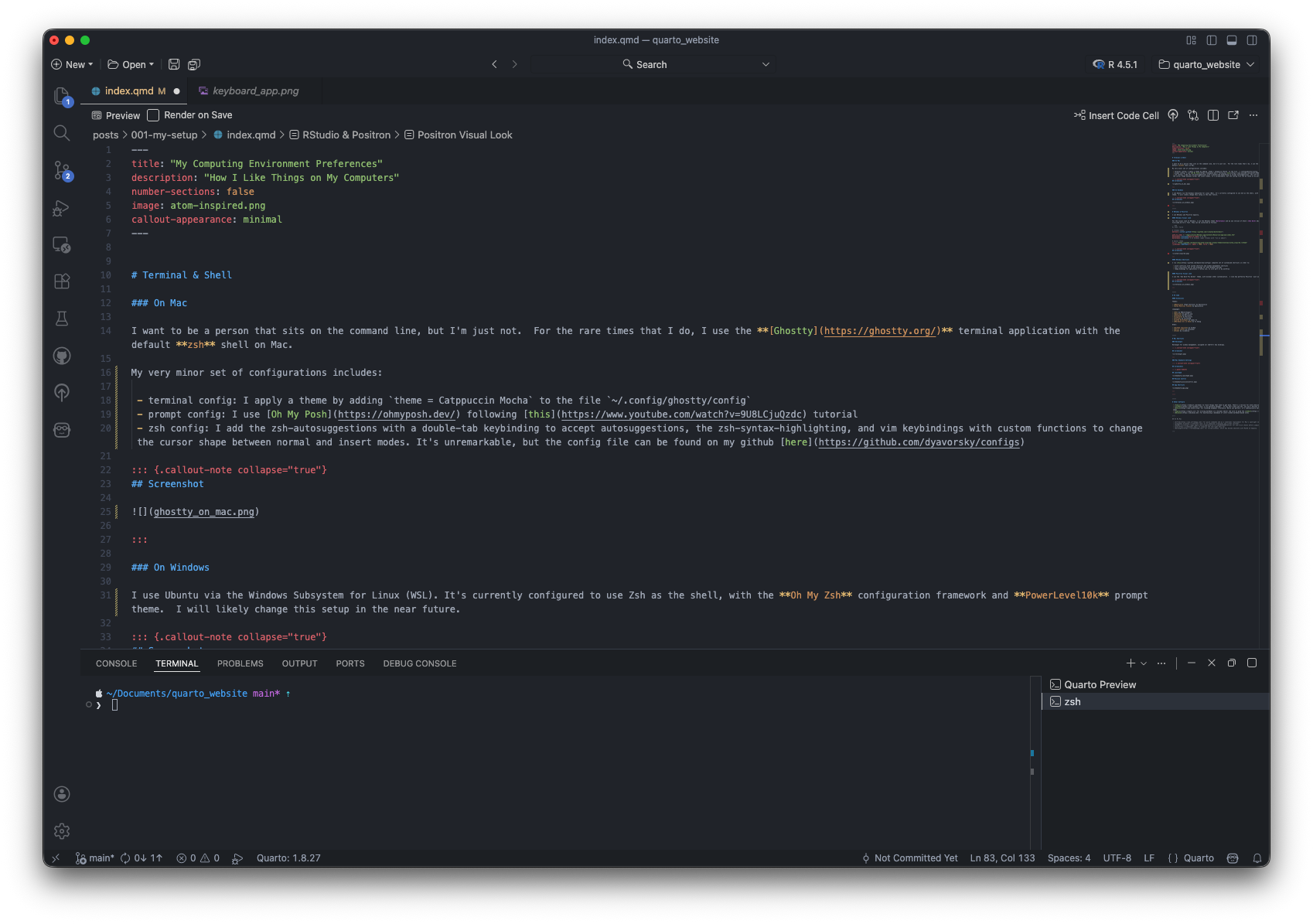 I want to be a person that sits on the command line, but I’m just not. For the rare times that I do, I use the Ghostty terminal application with the default zsh shell on Mac.